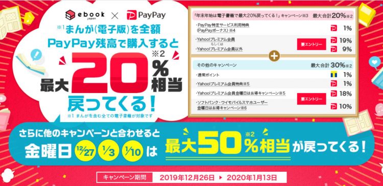 2019年12月26日(木)〜2020年1月13日(月)に世界最大級のまんが・電子書籍販売サイトebookjapanで電子書籍をPayPay残高で購入すると最大20%のPayPayボーナスが付与されます。